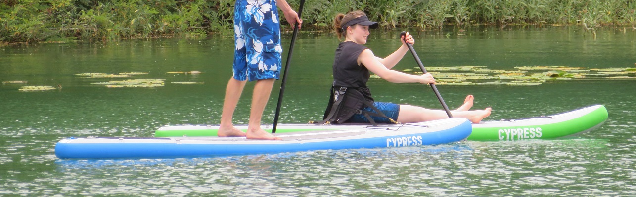 SUP green and blue This shows a man standing up and a woman sitting down, paddle boarding on a summer day. Like Loading...