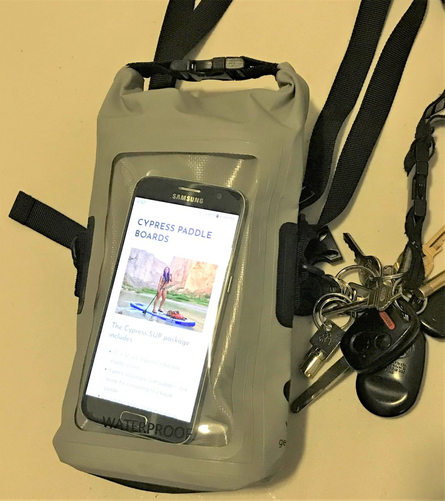- This is an awesome “Phone + a little more” waterproof dry bag for just $25. I love mine. It keeps the phone accessible (you can use it through the covering) and can hold keys, wallet, water bottle, etc.