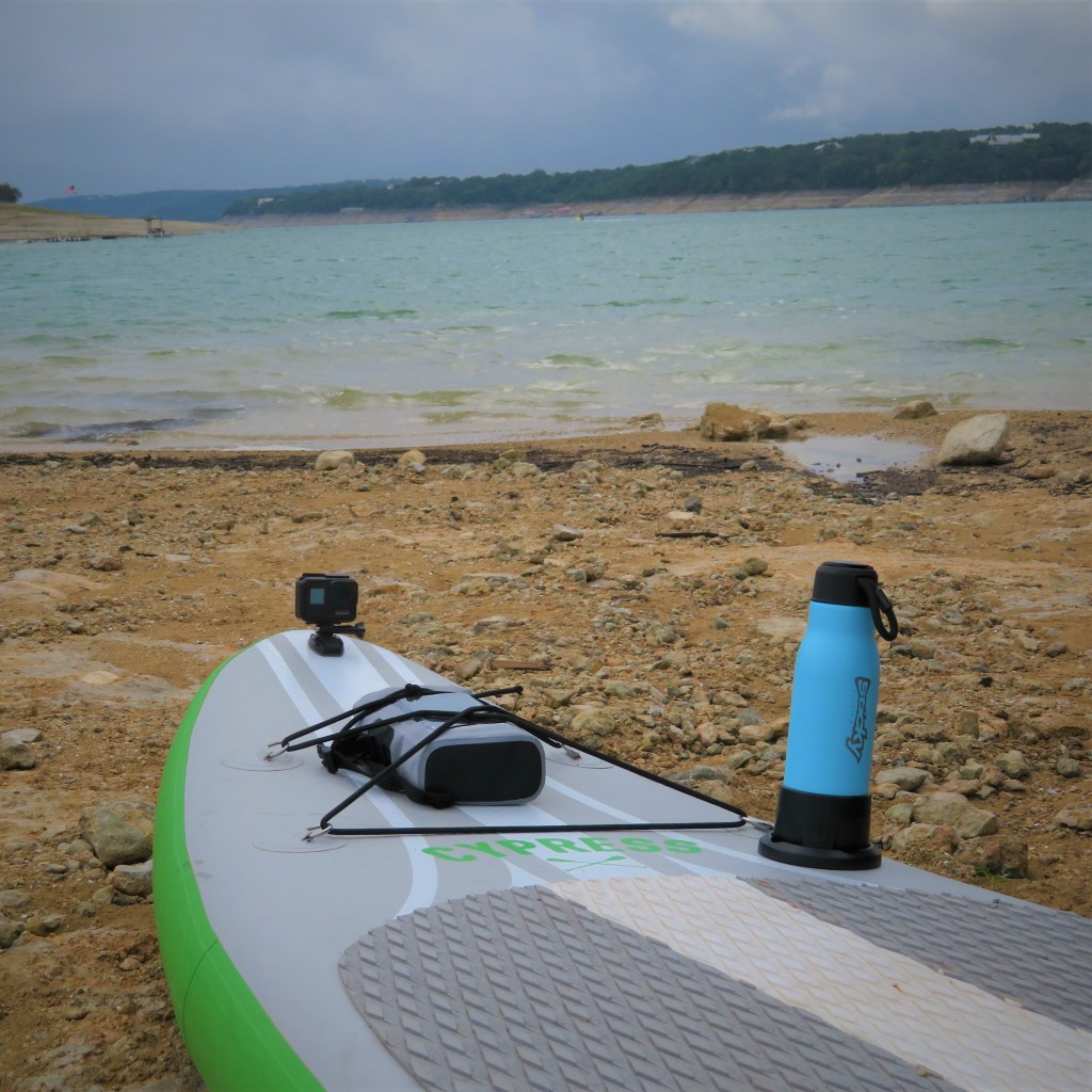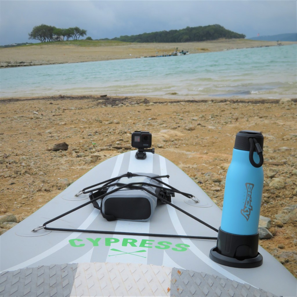 I’m digging this StickyFlask I picked up recently. It’s a 2-peice water bottle that stays rock-solid attached to my paddle board but easily detaches if I untwist the water bottle. Its way easier than how I would shove the water bottle in the bungies and hope it stayed in.