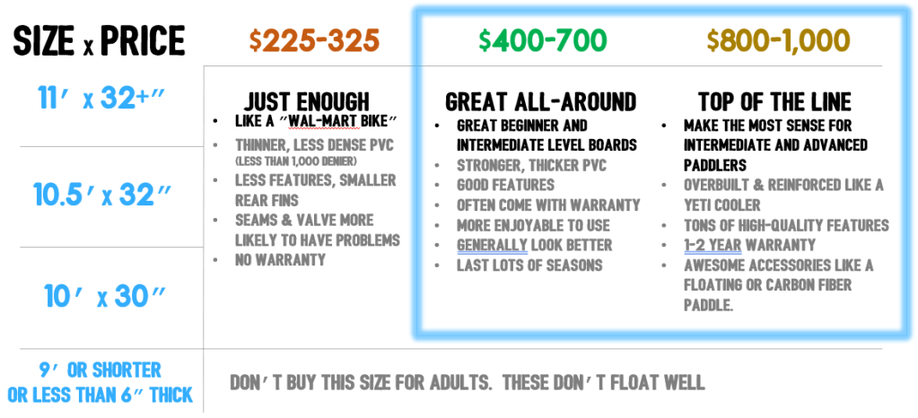 So let’s get to it! Here’s how I’ve grouped the top 14 SUP’s by size and price. All the boards are 6″ thick – anything less is too poor quality to float an adult.